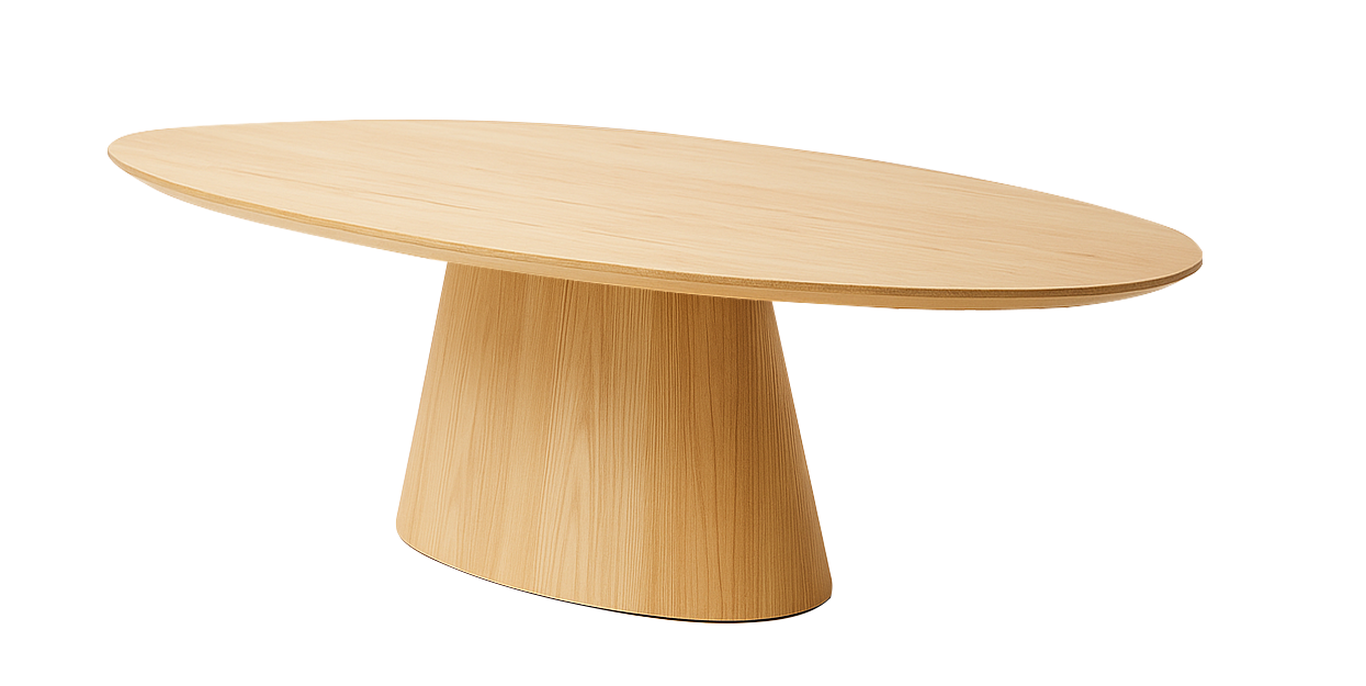 De mooie taps toelopende centrale poot van staal of hout gecombineerd met bijvoorbeeld een strak ovaal of trackvormig blad. Creëer de ideale setting voor zowel je klanten als je interne meetings.